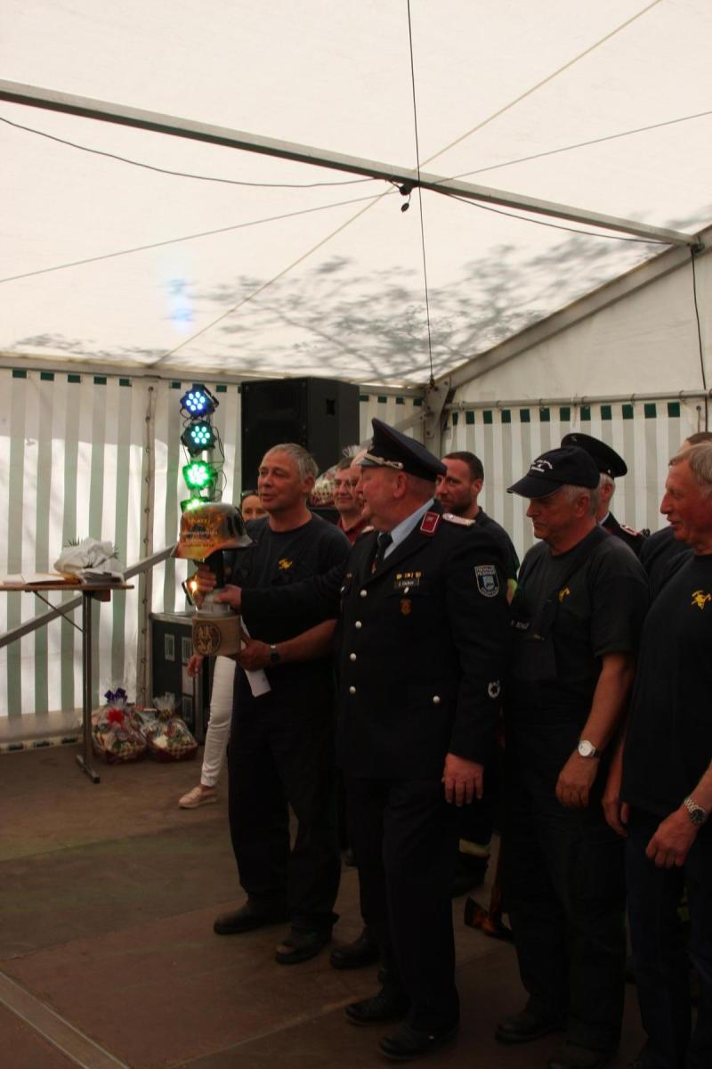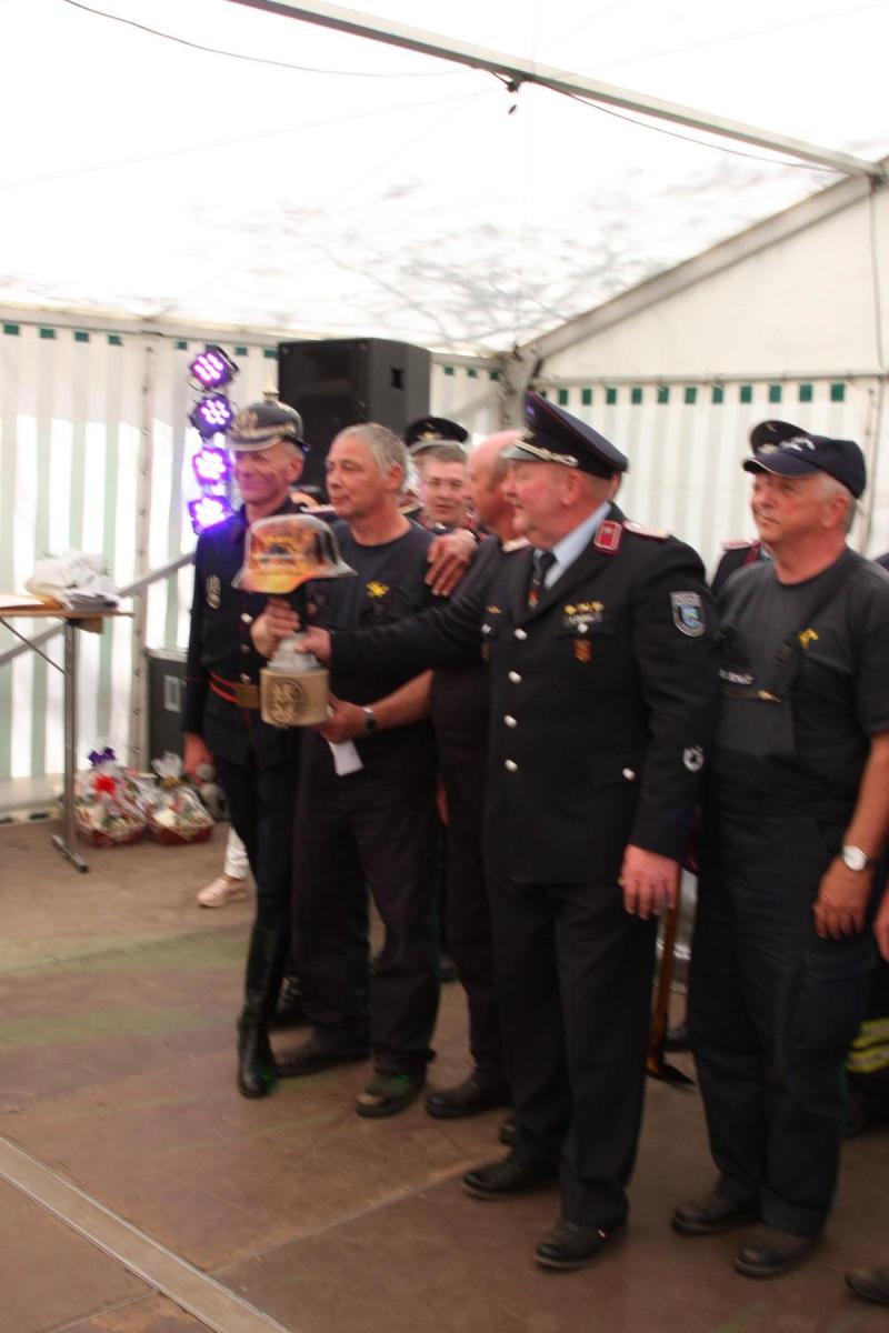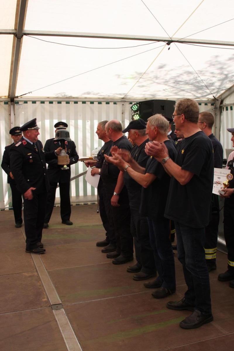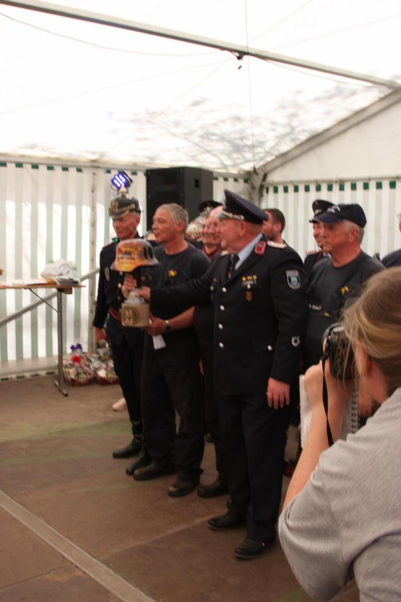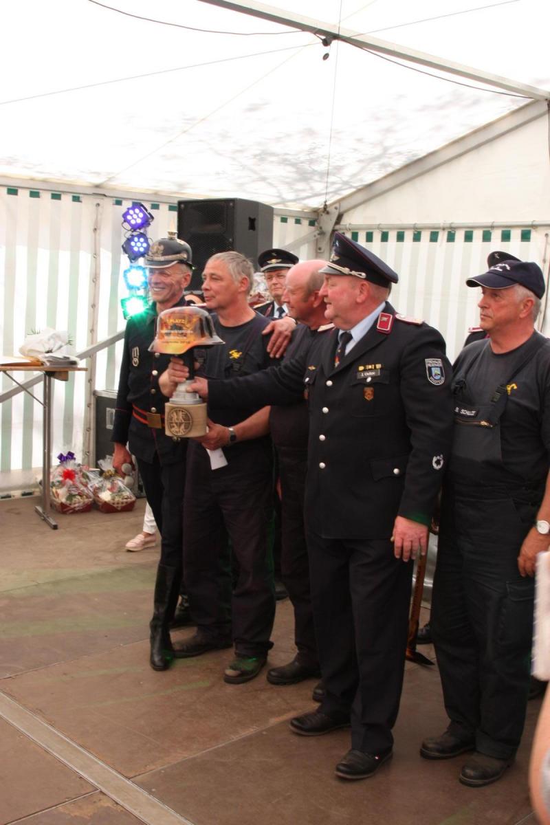 Volgfelde l Die Männer und Frauen um Wehrleiter Tino Klärner hatten zum 120. Geburtstag ihrer Wehr eingeladen. Die dann kamen – es waren neun Mannschaften inklusive Fans aus umliegenden Wehren – hatten allerdings „Geschenke“ dabei, die teils noch älter waren. Handdruckspritzen heißen die teils noch aus dem ausgehenden 19. Jahrhundert stammenden Geräte. Ein Wasserbecken auf vier Rädern, in das eine Pumpe gebaut ist. Das Wasser per Druck in den Feuerwehrschlauch zu befördern, ist in der Regel vier kräftigen Feuerwehrmännern vorbehalten, die eine Art Wippe auf und ab bewegen, während ein weiterer Feuerwehrmann ständig das für die Brandbekämpfung nötige Nass per Wassereimer nachfüllt.
