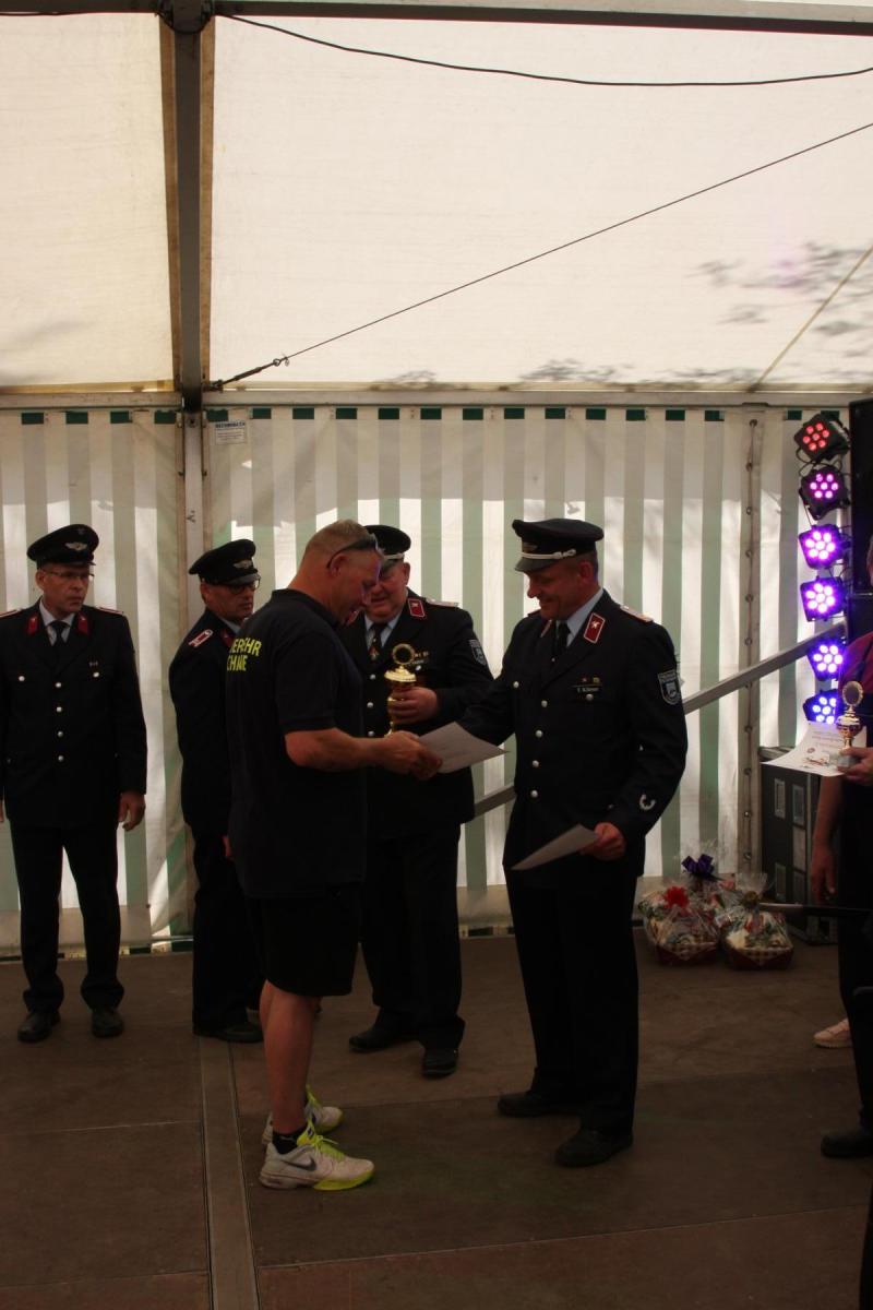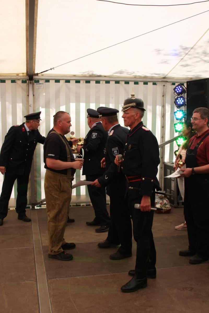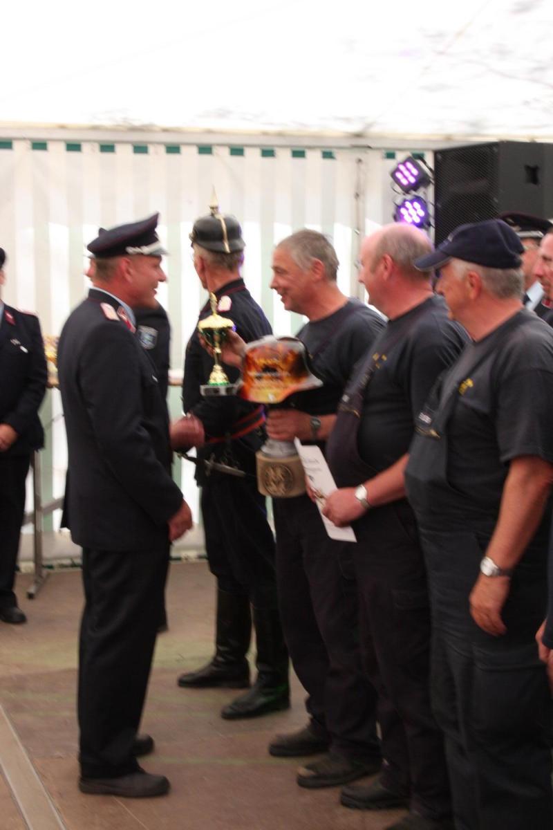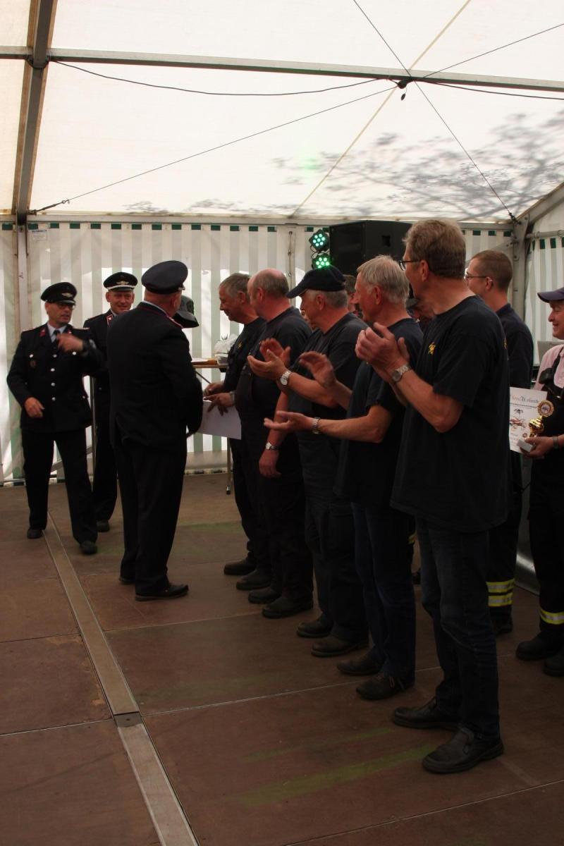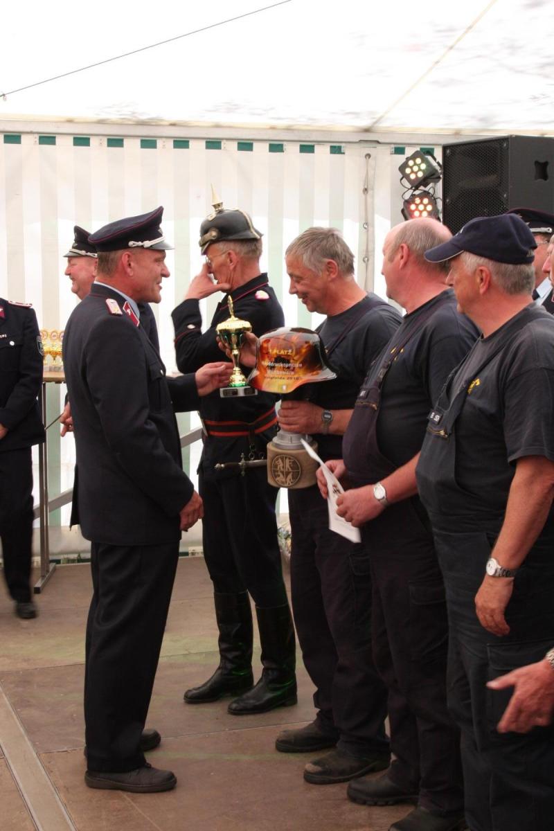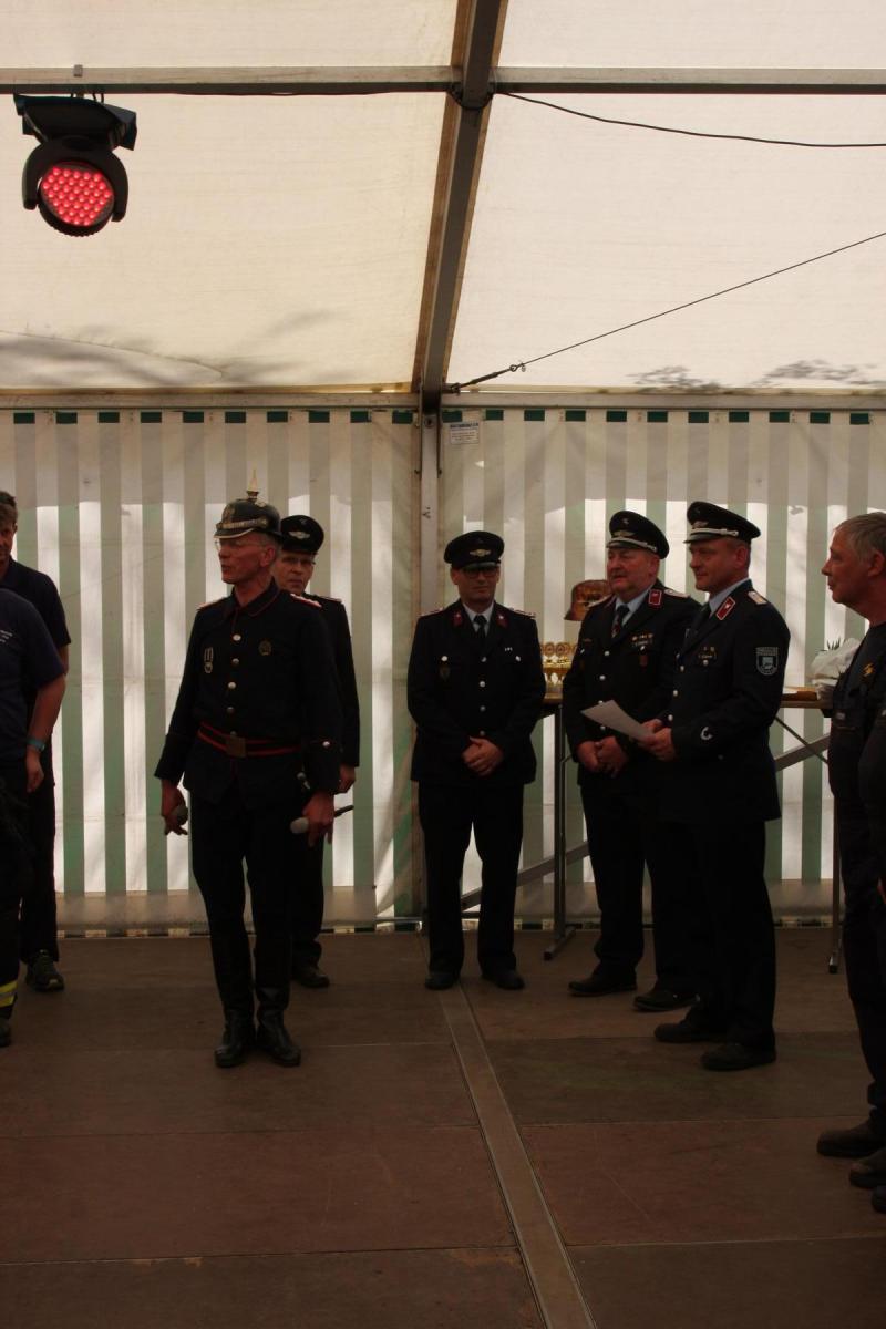 Volgfelde l Die Männer und Frauen um Wehrleiter Tino Klärner hatten zum 120. Geburtstag ihrer Wehr eingeladen. Die dann kamen – es waren neun Mannschaften inklusive Fans aus umliegenden Wehren – hatten allerdings „Geschenke“ dabei, die teils noch älter waren. Handdruckspritzen heißen die teils noch aus dem ausgehenden 19. Jahrhundert stammenden Geräte. Ein Wasserbecken auf vier Rädern, in das eine Pumpe gebaut ist. Das Wasser per Druck in den Feuerwehrschlauch zu befördern, ist in der Regel vier kräftigen Feuerwehrmännern vorbehalten, die eine Art Wippe auf und ab bewegen, während ein weiterer Feuerwehrmann ständig das für die Brandbekämpfung nötige Nass per Wassereimer nachfüllt.